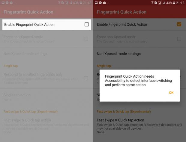 Quá trình tải về hoàn tất, mở ứng dụng lên và kích hoạt mục Enable Fingerprint Quick Action tại giao diện chính của ứng dụng.