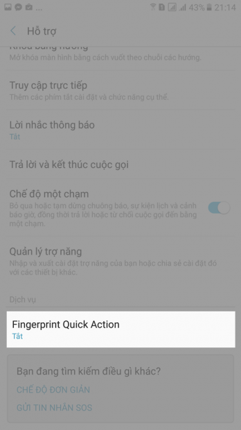Truy cập vào Hỗ trợ, và cấp quyền cho Fingerprint Quick Action. Tại đây bạn có thể quy định các thao tác chạm của phím Home bằng cách vào Single tap action và lựa chọn thao tác.