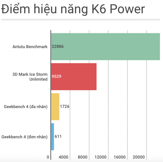 Vi xử lý Snapdragon 430 hoàn toàn đủ đáp ứng hầu hết mọi như cầu sử dụng hàng ngày của người dùng, tốc độ mở ứng dụng hệ thống khá nhau, độ trễ chấp nhận được, ít xảy ra hiện tượng giật, “lag”,ngay cả khi chơi các tựa games đồ hoạ nặng như Asphalt 8, Dead Trigger 2… K6 Power vẫn xử lý mượt mà ở mức đồ hoạ cao nhất, dù tốc độ vào game chưa thực sự nhanh nhưng việc mang đến một trải nghiệm mượt mà khi chơi cũng là điểm cộng lớn cho mẫu máy tầm trung này, khả năng chạy đa nhiệm của máy cũng rất tốt nhờ bộ nhớ RAM 3GB.