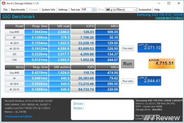 Các phần mềm được dùng để đánh giá hiệu năng được sử dụng trong bài gồm: Anvil's Storage Ultilities 1.1.0, HDTune Pro 5.60, CrystalDiskMark...