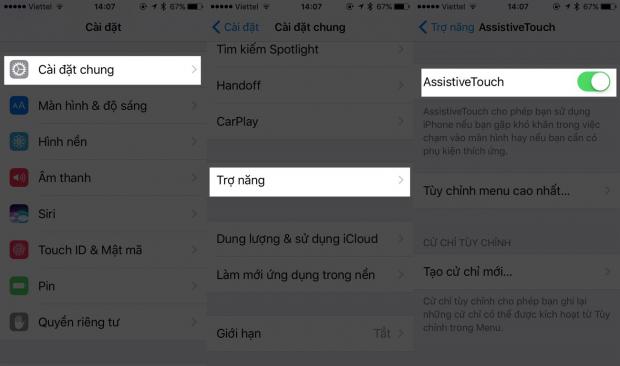 Để sử dụng tính năng của các phím cứng mà không cần chạm đến các phím này, hãy bật trợ năng Assistive Touch lên. Truy cập Cài đặt > Cài đặt chung > Trợ năng để tìm bật phím Home ảo.