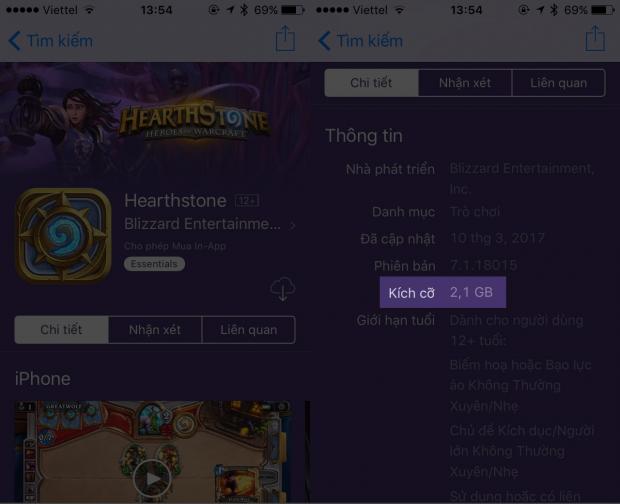 Tại sao lại cài thêm ứng dụng? Khi thiết bị có mức dung lượng bộ nhớ thấp hơn dung lượng yêu cầu tối thiểu của ứng dụng, ngay lập tức iPhone sẽ dọn rác trên toàn bộ dữ liệu hiện có. Bạn có thể tải các trò chơi có dung lượng lớn như Asphalt 8, Hearthstone,... Hay thuê một bộ phim dài tại iTunes cũng là một phương pháp giải phóng khá hay cho bạn.