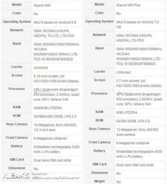 Tiếp theo là Xiaomi Mi 6 Plus, thiết bị này sẽ sở hữu màn hình có kích thước 5.7 inch với độ phân giải FullHD, vi xử lý Snapdragon 835, 6GB RAM công nghệ LPDDR4, bộ nhớ trong tùy chọn 64/128GB và chạy trên hệ điều hành Android 7.0 khi ra mắt. Ngoài ra, thiết bị này còn sở hữu cụm camera kép với độ phân giải 12MP với cảm biến IMX 362 đến từ Sony, camera selfie 8MP và viên pin dung lượng khủng 4500mAh.