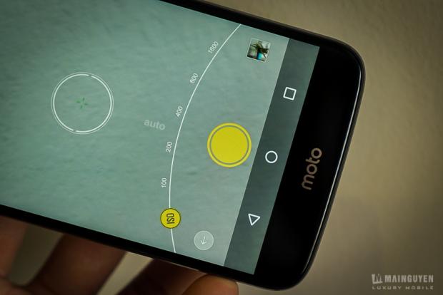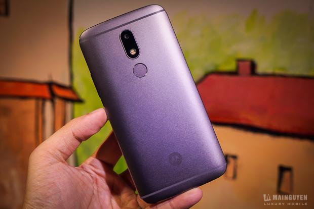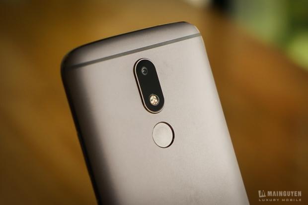 Điểm nhấn ở mặt lưng ngoài cảm biến vân tay là cụm camera chính và đèn flash LED thiết kế lồi trông như một cụm camera kép. Ở mặt trước, Moto M sở hữu màn hình 5,5 inch Full HD, mặt kính vê mép 2,5D. Phía trên màn là loa thoại, cảm biến và camera selfie. Trong khi ở dưới chỉ có logo hãng.