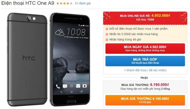Cụ thể, từ bây giờ đến hết ngày 15/4, khi bạn đặt mua online mẫu smartphone thiết kế đẹp HTC One A9, bạn sẽ được giảm giá từ 6.19 triệu xuống chỉ còn 4.95 triệu đồng, giảm hơn 1.2 triệu đồng.