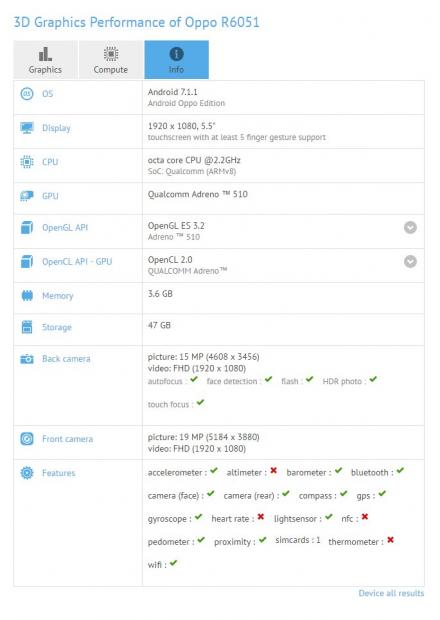 Ngoài ra, OPPO R11 sẽ sở hữu camera chính có độ phân giải 16MP (đáng tiếc là hệ thống GFXBench không thể nhận biết được sự khác biệt giữa camera đơn và camera kép) và camera selfie độ phân giải 20MP. Ngoài ra, cả camera trước và sau của máy cũng sẽ hỗ trợ quay phim với độ phân giải FullHD.