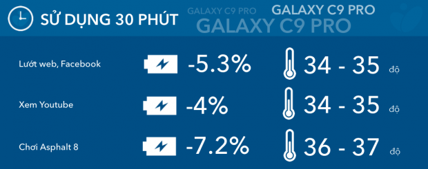 So với A9 Pro với viên pin lên tới 5.000 mAh, C9 Pro rõ ràng có kém hơn về thời gian sử dụng nhưng chênh lệch không thật sự quá nhiều. Qua thử nghiệm, Galaxy C9 Pro có thể on screen được 8 tiếng 42 phút, từ đó ước tính thời gian sử dụng hỗn hợp vào khoảng 21 tiếng 45 phút. Trong khi đó, thời gian sử dụng hỗn hợp của A9 Pro là 23 tiếng 15 phút.