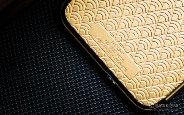 Sau khi hoàn thành công đoạn điêu khắc minh họa chủ đề, thân của Grand 7 GCB Art Deco tiếp tục trải qua bước phun hạt thủy tinh trong môi trường áp suất cao trước khi khoác lên lớp áo kim loại quý hiếm bằng vàng hoặc rhodium, tùy phiên bản. Saphia nguyên tấm được cắt và đặt chính xác lên vị trí tính toán trước. Vị trí này tạo thành điểm nhấn, với logo Mobiado bằng vàng nguyên chất phía dưới.