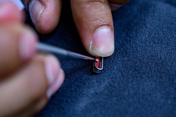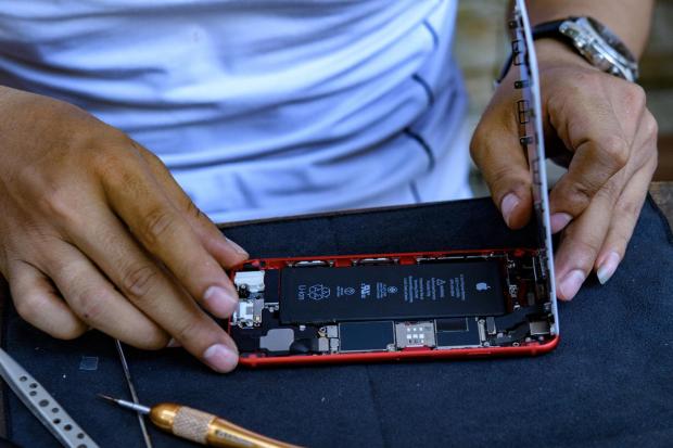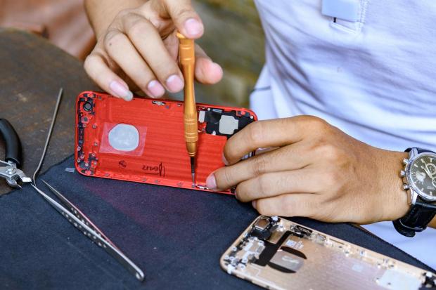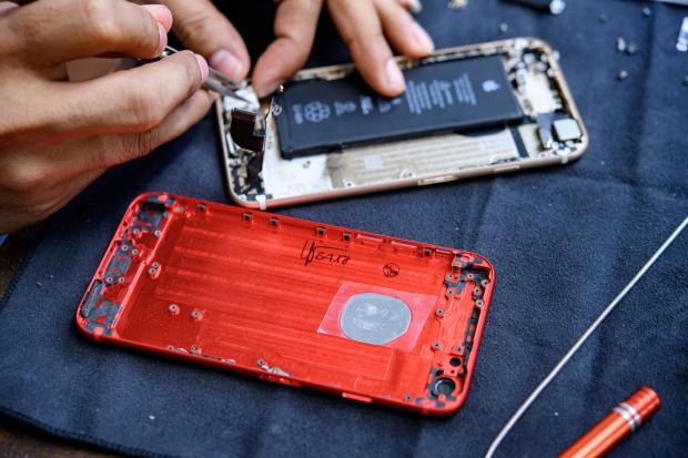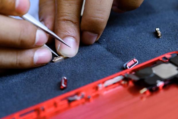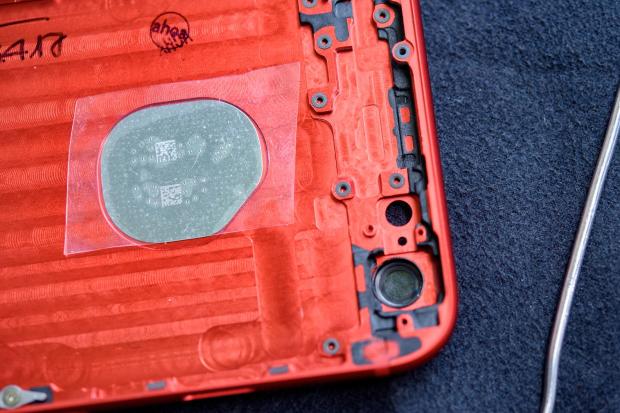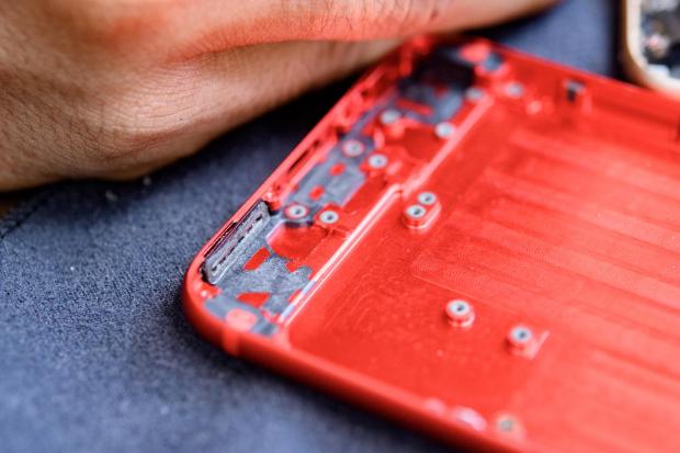 Cái màng loa vừa được mang từ chiếc iPhone 6 qua và dán vào vị trí mới trên chiếc vỏ đỏ.