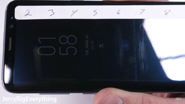 Đầu tiên là thử nghiệm độ bền của màn hình, màn hình trên Galaxy S8 vắt đầu xuất hiện những vết xước ở mức số 6 và hiện rõ hơn ở mức thứ 7