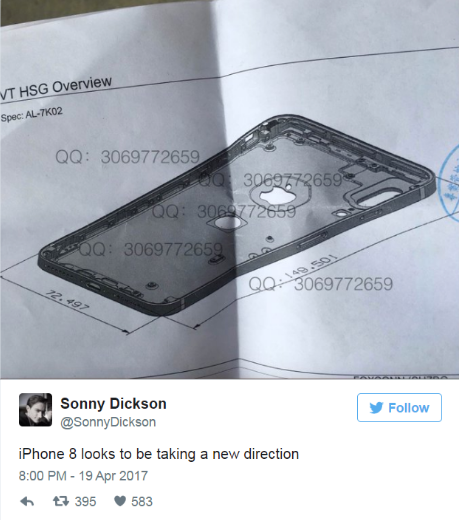 Theo đó một hình ảnh được cho là nằm trong bản phác thảo thiết kế của iPhone 8 được Sonny Dickson –một tài khoản nổi tiếng với các tiết lộ liên quan tới sản phẩm của Apple, đăng tải trên Twitter cá nhân. Qua đó thấy được phần nào thiết kế mặt lưng của thế hệ iPhone mới-điều vẫn khiến nhiều cư dân mạng băn khoăn. Đáng chú ý trong bản phác thảo iPhone 8, người ta thấy xuất hiện một “lỗ thủng” ở chính giữa mặt lưng phía sau, nàm ngay dưới logo quả táo của Apple.