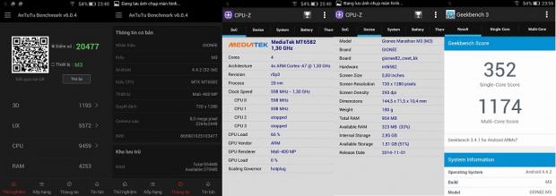 Trong các bài kiểm tra bằng các phần mềm chuyên sâu như Antutu v6.0 điểm số tổng mà M3 đạt được là 20.477 còn với phần mềm Geek Bench con số này là 1174 (đồ họa). Trong các tác vụ thông thường, M3 tỏ ra khá đơn giản để xử lý và hầu hết đều đạt mức yêu cầu mà mình đưa ra tuy nhiên nếu dùng quá nhiều ứng dụng một lúc thì đôi khi vẫn gặp trường hợp cảm ứng chậm hay giật. Khắc phục điều này, các bạn nhớ tắt bớt ứng dụng chạy ngầm để có trải nghiệm tốt hơn.