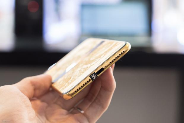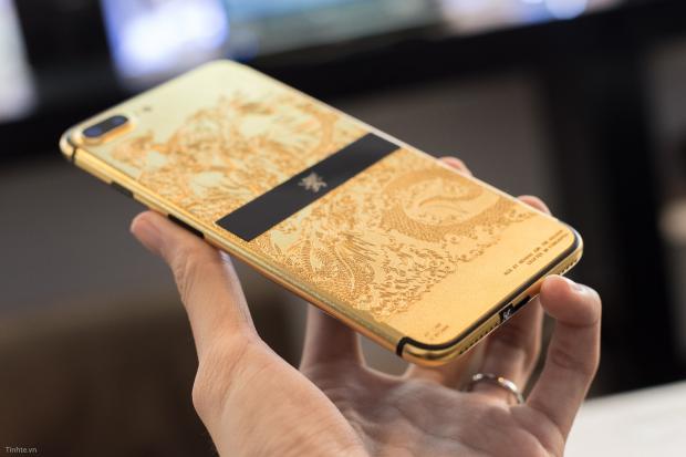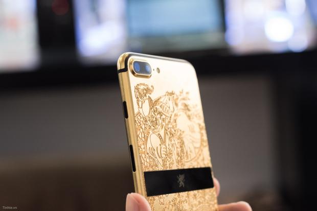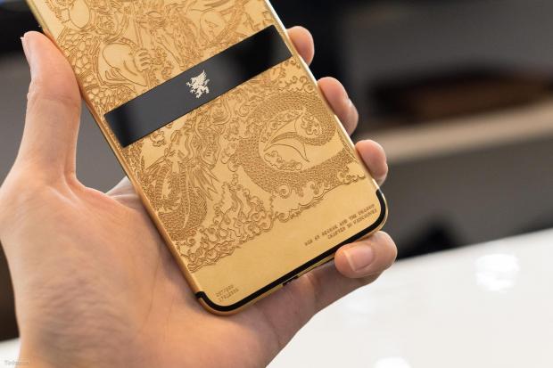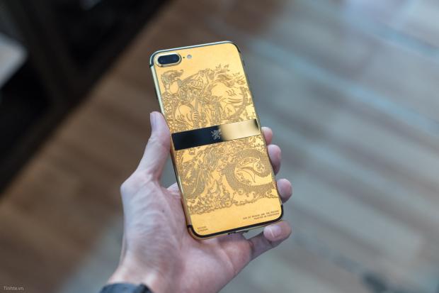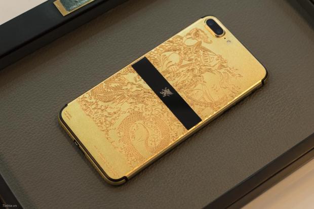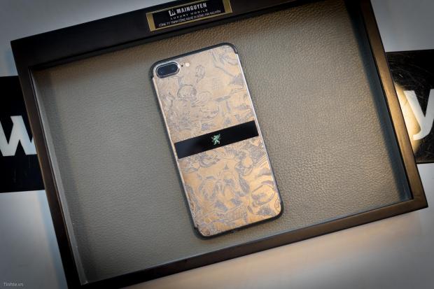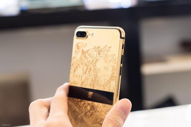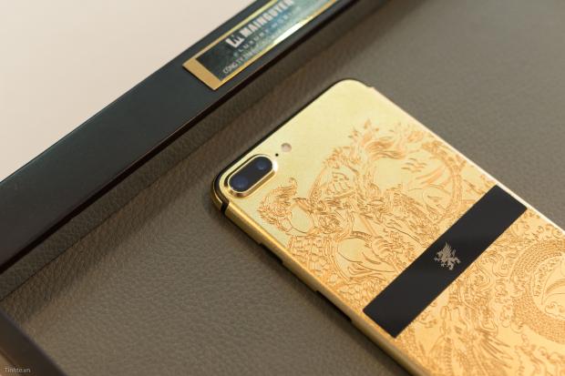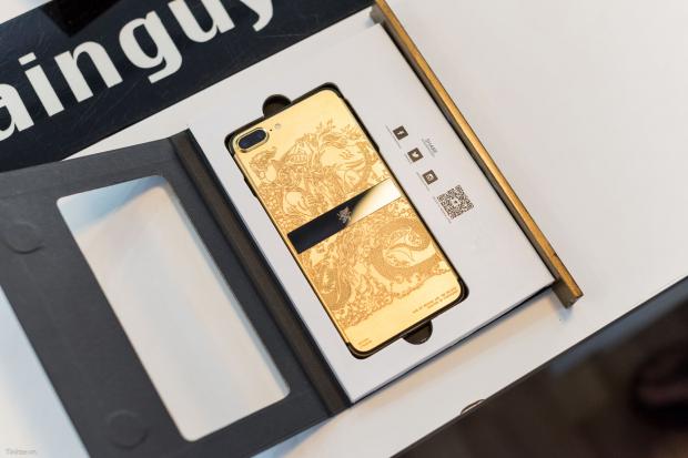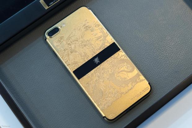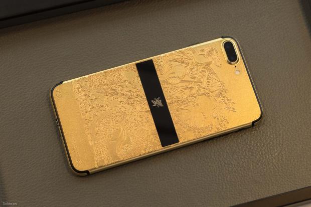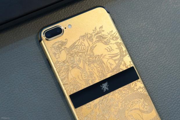 Đây là chiếc điện thoại Mobiado Grand7+ GCB - Saint George & Dragon, bên trong gồm một chiếc iPhone 7 Plus 256 GB, còn lớp vỏ bên ngoài do Mobiado chế tác với chất liệu chính là vàng thật và Sapphire. Toàn bộ lớp vỏ zin của máy đã được Mobiado tháo ra và thay bằng một lớp vàng dày và nặng hơn chứ không phải chỉ là lớp mạ. Mặt lưng có khắc hình Thánh George và Con Rồng (Saint George & Dragon). Chỉ có 200 máy được làm ra.
