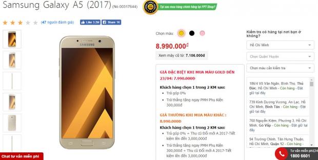 Theo đó, từ bây giờ đến hết ngày 23/4, khi bạn mua Galaxy A5 2017 phiên bản màu gold bạn sẽ được giảm ngay 1 triệu đồng, từ 8.99 triệu xuống chỉ còn 7.99 triệu đồng, hấp dẫn chưa nào?