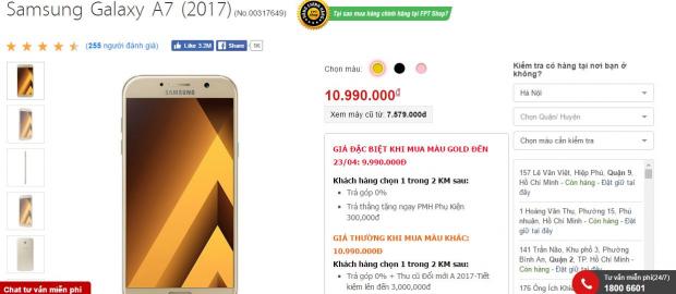 Theo đó, trong 2 ngày từ 22-23/4, khi bạn mua model màu gold của Galaxy A7 2017 bạn sẽ được giảm giá 1 triệu đồng, từ 10.99 triệu xuống chỉ còn 9.99 triệu đồng.