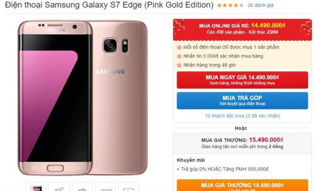 Theo đó, trong chương trình mua online giá rẻ, Galaxy S7 Edge màu hồng vàng sẽ được giảm giá từ 15.49 triệu xuống còn 14.49 triệu đồng, giảm 1 triệu đồng. Lưu ý chương trình này sẽ kết thúc vào hôm nay (23/4), vì vậy bạn hãy nhanh tay lên nhé.