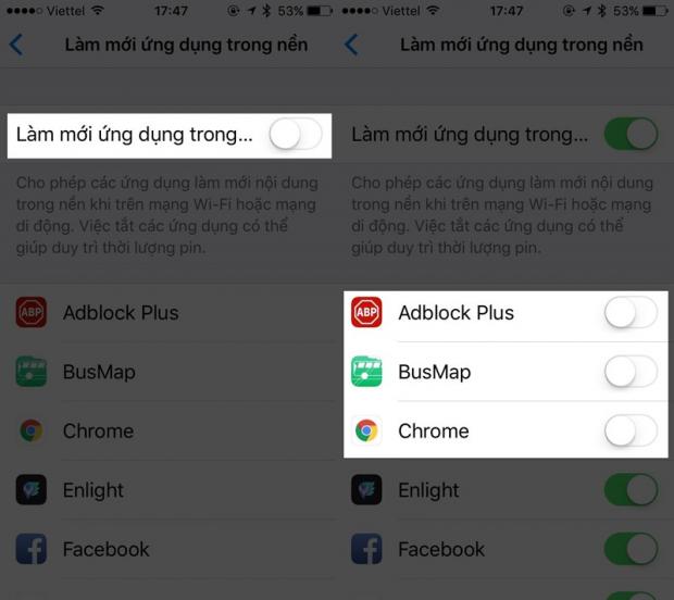 Hoặc bạn vô hiệu hóa hoàn toàn tính năng bằng cách gạt tắt Làm mới ứng dụng trong nền, hoặc chỉ vô hiệu một số ứng dụng không cần thiết.