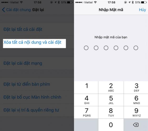 Sau đó chọn reset dòng số 2, Xóa tất cả nội dung và cài đặt. Sau đó làm theo hướng dẫn để quá trình đặt lại iPhone được thực hiện.