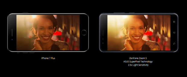 Hệ thống cảm biến camera mà Asus sử dụng trên Zenfone Zoom S là một cặp cảm biến Sony IMX362 (12MP) kết hợp cùng hệ thống thấu kính f/1.7 cho phép đạt mức độ zoom quang học tự nhiên tới 2.3x một cách hoàn hảo. Để đảm bảo cho hình ảnh không bị rung nhòe ở mức độ zoom lớn này, Asus tích hợp đồng thời cả hệ thống chống rung quang học và chống rung điện tử kết hợp với công nghệ lấy nét tự động theo pha DualPixel như trên Galaxy S7 của Samsung. Theo lời khẳng định của Asus thì Zenfone Zoom S có mức độ nhạy sáng cao hơn tới 2,5 lần so với iPhone 7 Plus.