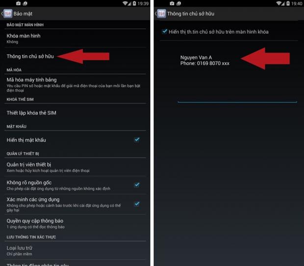 - Truy cập vào Cài đặt > Bảo mật > Thông tin chủ sở hữu > Kích chọn vào 'Hiển thị thông tin chủ sở hữu trên màn hình khóa' > Nhập vào thông tin cần thiết.