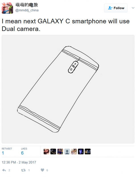 Theo Phonearena, mặc dù có nhiều thông tin về Galaxy Note 8 trang bị camera kép nhưng tất cả vẫn chưa được Samsung xác nhận. Đặc biệt hơn, mới đây một bản phác thảo Galaxy C xuất hiện trên Twitter cho thấy nó được tích hợp cả camera kép mặt sau. Ngoài ra, mặt sau của Galaxy C cũng phác họa các dải ăng ten 3 sọc tương tự dòng Galaxy C hiện tại nhưng chưa rõ đây sẽ là Galaxy C “mấy”.
