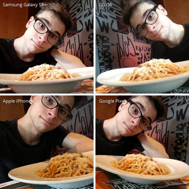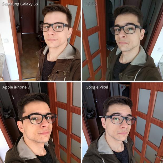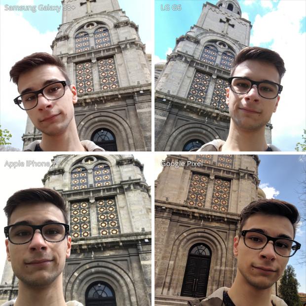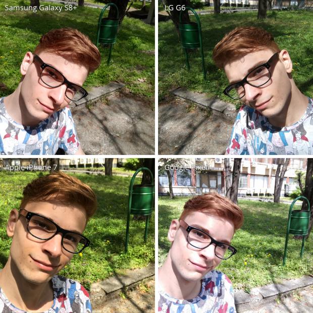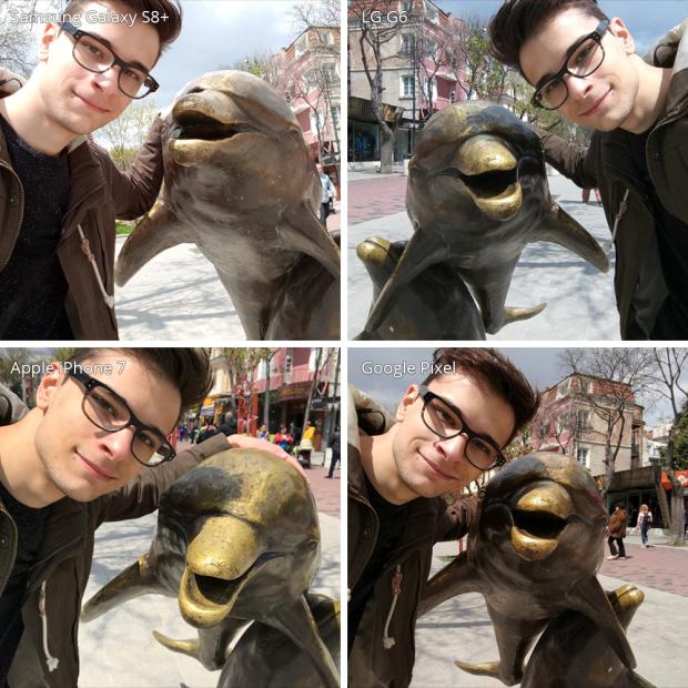 Ở cảnh này, ảnh chụp trên Galaxy S8 đã có xu hướng kéo độ sáng và bão hòa lên quá mức, ngoài ra mặt của người chụp cũng bị mất đi một số chi tiết. Hình ảnh trên chiếc LG G6 trông thức tế hơn nhưng lại xuất hiện nhiều noise. Trong khi đó, hình ảnh trên chiếc iPhone 7 không thực tế và trông giống như đã qua một bộ lọc nào đó. Chiếc Pixel là thiết bị làm tốt nhất trong thử thách này, tuy nhiên khuôn mặt của tác giả lại có xu hướng hơi đỏ.