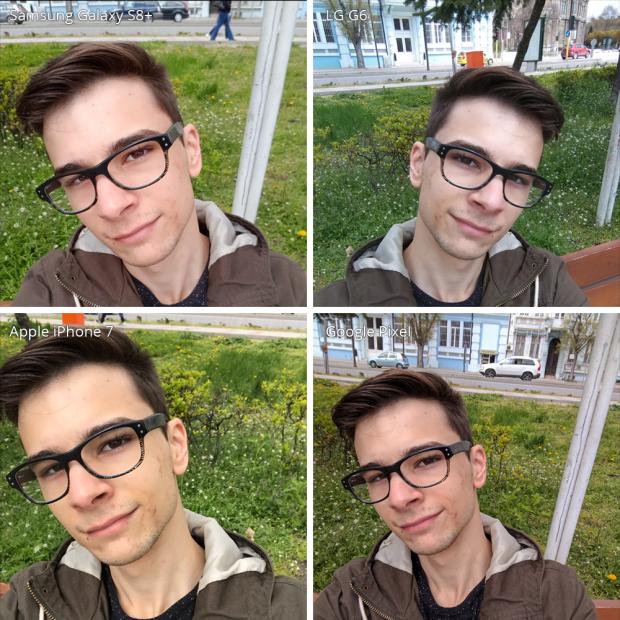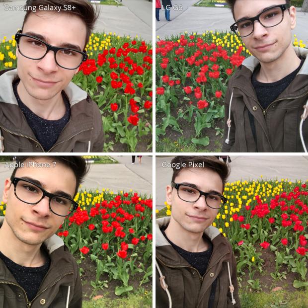 LG G6 là thiết bị thể hiện phong độ tốt nhất trong cảnh này với màu sắc trung thực. Phần da mặt trên chiếc Pixel và Galaxy S8 có xu hướng ngả sang màu đỏ một chút, ngoài ra ảnh trên Galaxy S8 có xu hướng tăng độ sáng và vì thế đã bị mất một số chi tiết. Trong khi đó ảnh chụp từ iPhone cho màu sắc ám vàng nặng và trông khá tệ.
