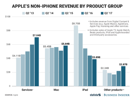 Giới truyền thông vẫn từng hỏi, ngoài “con gà đẻ trứng vàng” iPhone thì Apple đang kinh doanh như thế nào với các mãng dịch vụ, sản phẩm khác của hãng. Theo bảng thông kê, “ngôi sao” thứ 2 của Apple là kinh doanh các dịch vụ, trong đó gồm có App store, App Pay, App Music, iTune, iCloud…Apple cho hay mãng kinh doanh này mang về khoản doanh thu 7,04 tỷ USD trong quý II vừa qua. Đây là quý thứ 2 liên tiếp mảng dịch vụ của Apple vượt ngưỡng doanh thu 1,05 tỷ USD so với cùng kỳ năm ngoái. Tuy vậy mảng dịch vụ này cũng chỉ mang lại chưa tới 1/5 nguồn thu từ “con gà đẻ trứng vàng” iPhone.