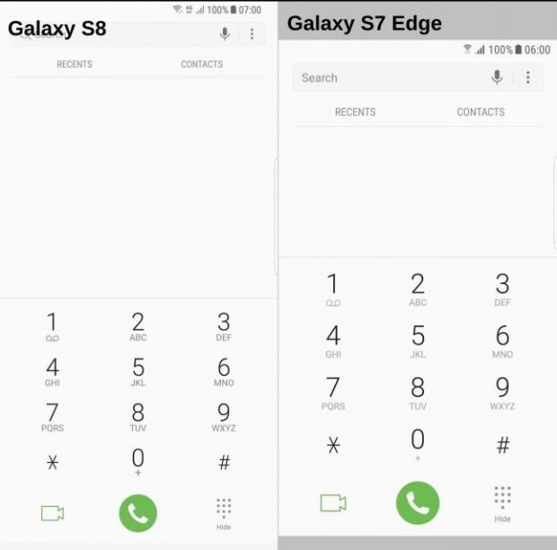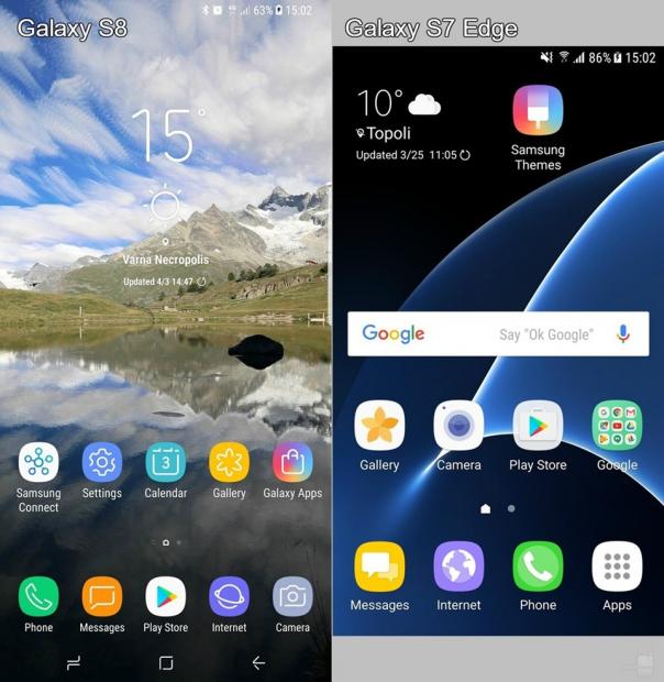 Nhìn chung, các ứng dụng như Gọi điện, Nhắn tin, Thư viện ảnh, Theme và Game Launcher trên S8/S8+ có diện tích hiển thị lớn hơn so với S7 Edge. Điều này cũng dễ hiểu vì thiết kế tràn cạnh cùng tỉ lệ 18.5:9 cho phép màn hình hiển thị nhiều thứ hơn. Người dùng sẽ không còn phải lướt hay trượt xuống nhiều.