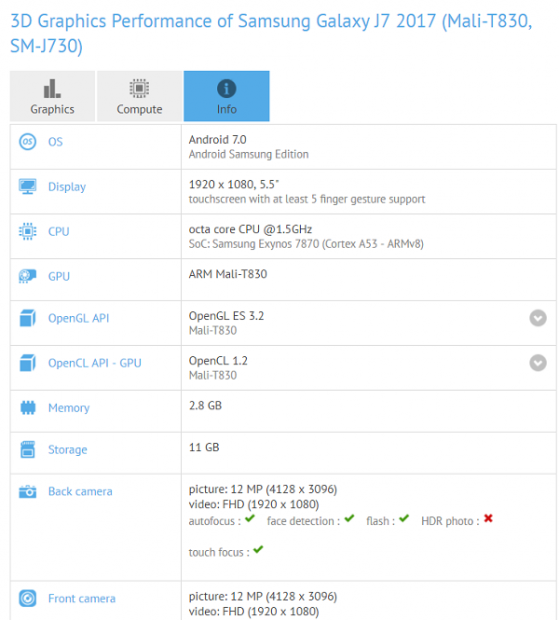 Càng gần với ngày ra mắt thì Galaxy J7 2017 càng xuất hiện nhiều thông tin hơn, mới đây, mẫu smartphone này bị phát hiện đang có mặt trên GFXBench và nhờ vậy, nhiều thông số cấu hình đã lộ diện.
