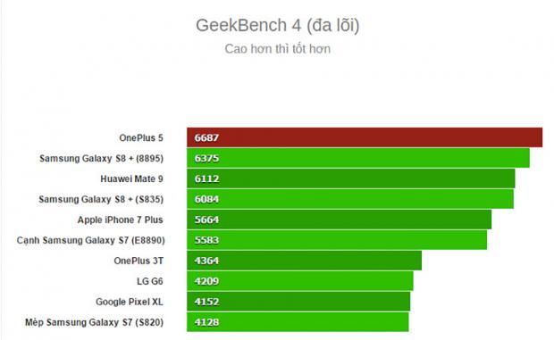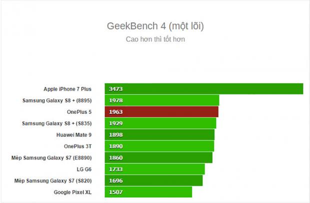 Theo đó trong bài kiểm tra hiệu năng xử lý của CPU, điểm số Geekbench của OnePlus 5 là 1963 và 6687 tương ứng với các bài test điểm đơn và đa nhân. Trong khi đó, XZ Premium chỉ có 1943 điểm đơn nhân và số điểm đa nhân chỉ là 5824. Còn mẫu flagship của Samsung là Galaxy S8 ở phiên bản chạy vi xử lý Snapdragon 835 cũng chịu chung số phận khi có số điểm đơn nhân và đa nhân lần lượt là 1929 và 6084.