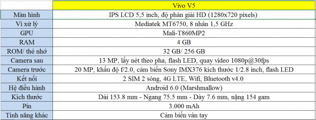 Vivo V5 được trang bị vi xử lý Mediatek MT6750 8 nhân xung nhip 1,5 GHz, RAM 4 GB và người dùng sẽ có 32 GB bộ nhớ trong để lưu trữ dữ liệu. Nhìn chung, so với tầm giá thì cấu hình của Vivo V5 khá ấn tượng khi đây là một trong những số ít smartphone có dung lượng RAM 4 GB. Thêm vào đó, bộ vi xử lý 8 nhân 1,5 GHz đến từ hãng Mediatek cung cấp cho V5 một hiệu năng đủ mạnh và ổn định để xử lý mượt mà và trơn tru các tác vụ thường ngày của người dùng.