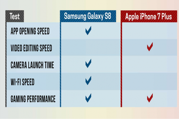 Samsung Galaxy S8 và iPhone 7 Plus đều là những smartphone thuộc phân khúc cao cấp tuy nhiên qua các bài thử nghiệm thì S8 đã giành chiến thắng và trở thành smartphone nhanh nhất trong phân khúc cao cấp giữa S8 và iPhone 7 Plus.