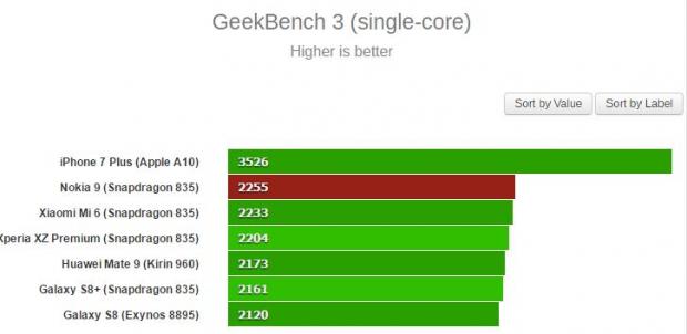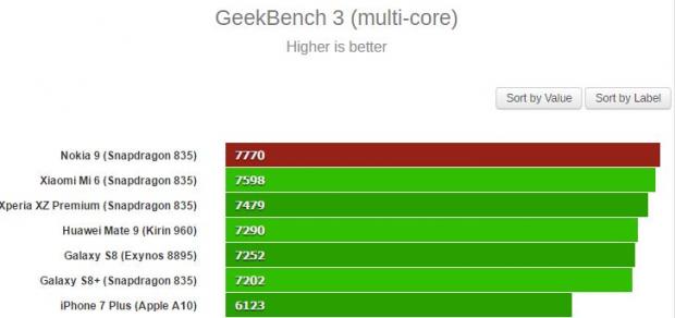 Theo Gsmarena, Nokia 9 chạy chip Snapdragon 835 đã đạt điểm hiệu năng đa lõi trên Geekbench 3 là 7770 điểm, cao nhất từ trước tới nay, vượt qua cả Xiaomi Mi 6, Xperia XZ Premium và cả Galaxy S8 Plus (Snapdragon 835).