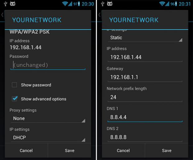 Có thể do mạng bị chậm nên bạn sẽ không thể tải ứng dụng về máy thông qua Google Play Store và thường xuyên gặp lỗi Connection Time Out. Để fix lỗi này, bạn hãy vào Cài đặt -> Không dây & mạng -> Cài đặt WIFI -> bấm phím Menu rồi chọn “Nâng cao”. Tại đây hãy tick vào mục “Sử dụng IP tĩnh” và tiến hành nhập vào địa chỉ DNS như sau vào: DNS1: 4.2.2.1 và DNS2: 4.2.2.2
