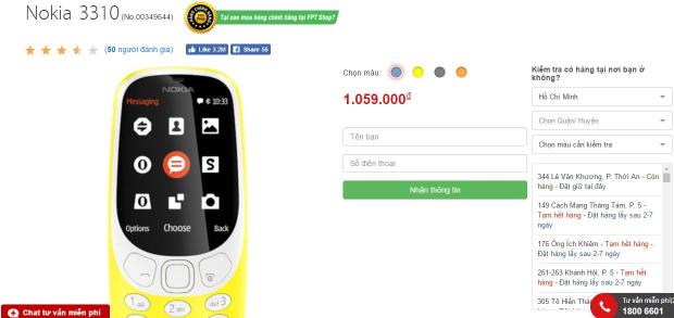 Hiện tại, Nokia 3310 2017 được bán tại nước ta với giá 1.059 triệu đồng tại hệ thống bán lẻ FPTShop.com.vn, mức giá khá hấp dẫn đối với nhiều tín đồ công nghệ tại Việt Nam. Bạn có thể đăng ký và nhận thông tin khi có hàng ngay TẠI ĐÂY