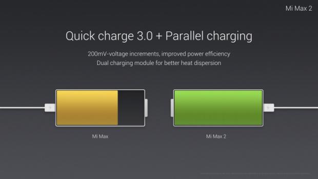 Khác với thông tin rò rỉ trước đó thì Mi Max 2 có dung lượng pin 5.300mAh, hỗ trợ công nghệ sạc nhanh Quick Charge 3.0 trong 1 tiếng có thể sạc được 68% pin và kết hợp với công nghệ sạc song song giúp ổn định dòng điện khi sạc, ít nóng máy hơn.