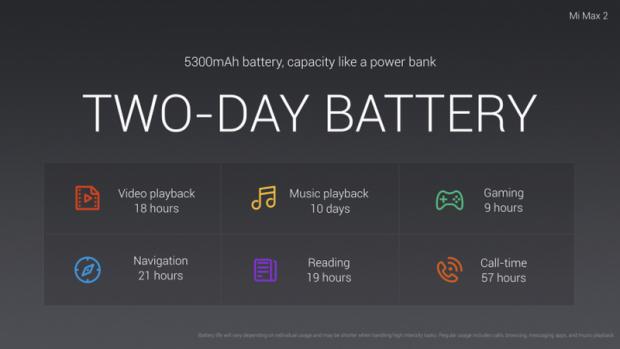 Thông tin còn cho biết với dung lượng pin khủng như vậy thì bạn có thể thoải mái sử dụng đến 2 ngày mới phải sạc. Bất ngờ là viên pin của Mi Max 2 có thể trụ được 8 tiếng xem phim, 10 ngày nghe nhạc liên tục, 9 tiếng chơi game, 21 tiếng định vị, 19 tiếng đọc sách và 57 tiếng gọi điện liên tục.