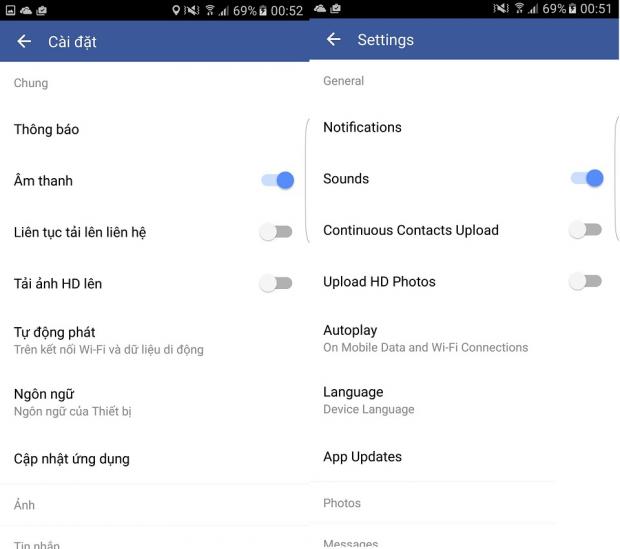 Đầu tiên các bạn cần cập nhật Facebook lên phiên bản mới nhất. Để bật tính năng này lên hãy mở ứng dụng lên và truy cập phần Tùy chọn ứng dụng trong Cài đặt rồi kích hoạt tính năng Tải ảnh HD lên (Upload HD photos).