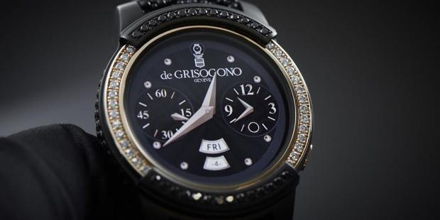 '56 viên kim cương trắng khoảng 1,2 carat xung quanh mép của mặt đồng hồ tròn. Phần viền làm bằng vàng hồng và thép đen không gỉ đính kèm 71 viên kim cương màu đen khoảng 1,8 carat. Dây đeo từ da cá đen có chữ ký de Grisogono.'