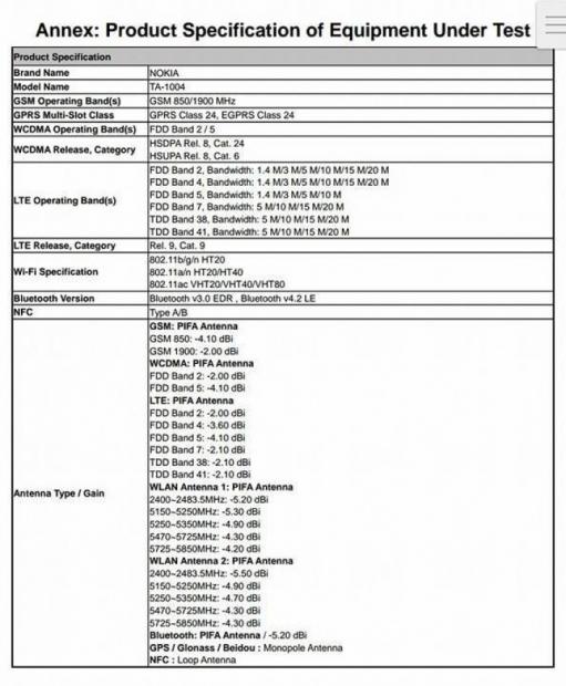 Tài liệu tại FCC không ghi rõ chi tiết cấu hình của Nokia 9 hoặc chỉ xuất hiện vài chi tiết nhỏ như hỗ trợ NFC, Bluetooth 4.2 cùng tên mã TA-1004. Ngoài ra, máy sẽ hỗ trợ cả mạng GSM và CDMA.