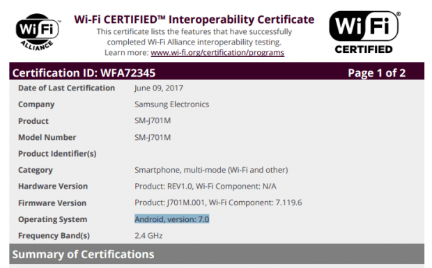 Cụ thể, trang Phonearena vừa chia sẻ một hình ảnh cho thấy Galaxy J7 (2015) vừa đạt chứng nhận Wifi khi đang chạy trên nền tảng Android 7.0. Thiết bị này được liệt kê với tên mã SM-J701M, đây là một trong những biến thể của Galaxy J7 (2015).