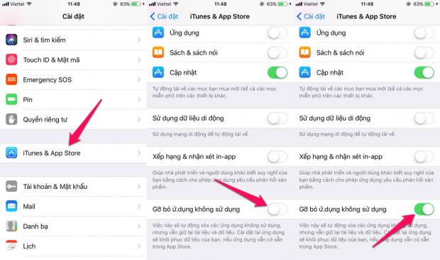 Ngoài ra bạn cũng có thể cài đặt thao tác gỡ bỏ tự động ứng dụng không sử dụng thường xuyên nhưng vẫn dữ được dữ liệu bằng cách mở Cài đặt > chọn mục iTunes & App Store và kích hoạt chế độ 'Gỡ bỏ ứng dụng không sử dụng'.