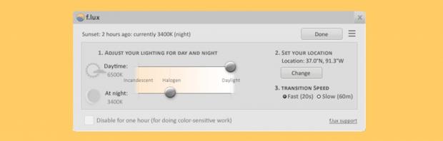 F.lux là một trong những ứng dụng sử dụng công nghệ EyeCare để giảm ánh sáng xanh trên màn hình Laptop nổi tiếng nhất thế giới. Tính năng hay ho nhất của f.lux là nó có thể tự động điều chỉnh cường độ bộ lọc dựa trên thời gian trong ngày. Những gì bạn cần làm là nhập mã code để ứng dụng xác định vị trí của bạn. Sau đó nó sẽ tự điều chỉnh. Nếu bạn ở VN, hãy nhập mã định vị 700000 khi sử dụng ứng dụng này nhé.