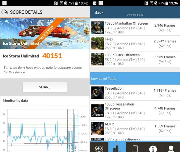 Với phần mềm 3D Mark, HTC U11 đạt được số điểm 40,151, cao hơn so với con số 37,810 mà mình từng đo được trên iPhone 7. Bên cạnh 3D Mark, mình sử dụng thêm phần mềm GFX, số khung hình mà HTC U11 đạt ở mức cao và giữ ổn định. Điều này cho thấy GPU Andreno 540 thực sự được nâng cấp rất nhiều so với thế hệ Adreno trước đây.