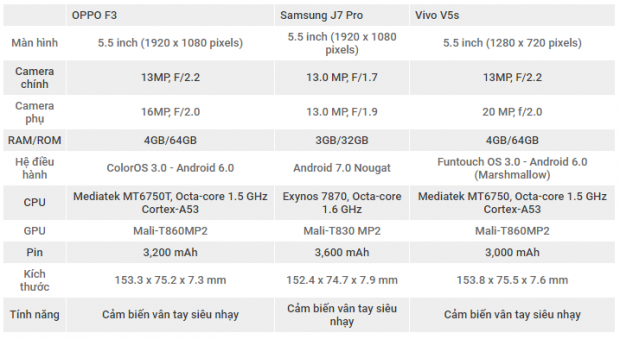 Hai sản phẩm được lựa chọn để so sánh cấu hình với OPPO F3 là Vivo V5s và Samsung Galaxy J7 Pro, cả hai mẫu smartphone này đều được bán với giá 6,9 triệu đồng và tương đương với giá bản của OPPO F3.