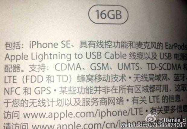 Hình ảnh được chụp lại từ vỏ hộp mẫu Iphone 4inch vừa được GSMArena hé lộ. Theo đó tên gọi chính thức của sản phẩm là Iphone SE (se viết hoa) chứ không phải Iphone 5se hay Iphone 6c như những tin đồn trước đó. Có thể thấy rõ phiên bản 16Gb được ghi rõ trên vỏ hộp, nhiều thông tin cho biết Apple sẽ cho 2 tùy chọn phiên bản bộ nhớ Iphone SE là 16Gb và 64Gb.