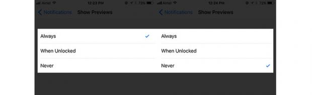 Bước 3. Cuối cùng, bạn chuyển đổi phần Always sang Never để tắt các thông báo hiển thị xem trước cho iPhone, iPad trên iOS 11.