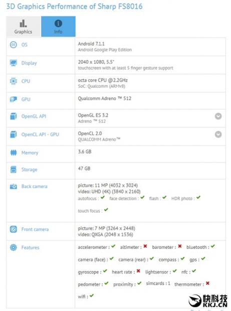 Trên GFXBench, Sharp FS8016 cũng lộ cấu hình đầy đủ với chip Snapdragon 660, đồ họa Adreno 512, RAM 4 GB, ROM 64 GB cùng camera trước sau 8/12 MP. Ngoài ra, máy cũng chạy trên nền tảng Android 7.1.1.