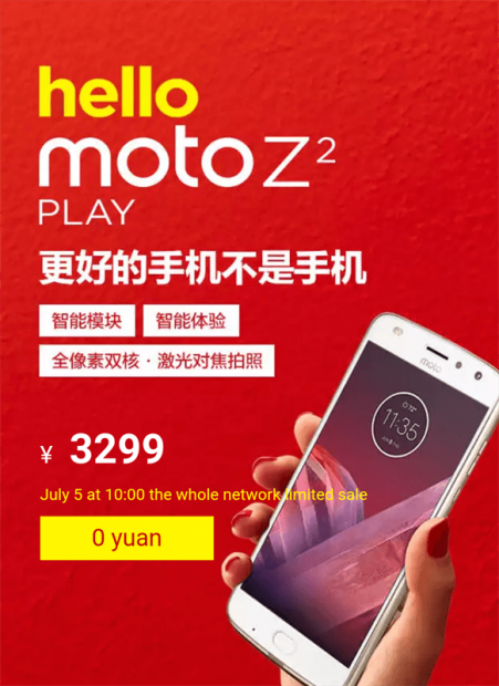 Moto Z2 Play sẽ được bán ra lúc 10:00 sáng, ngày 5/7/2017, với giá ¥3299 (khoảng 11 triệu đồng).